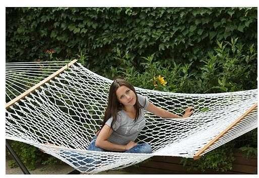 A fehér függőágy fonott PE kötélből készült. A kötél elegendő szilárdságot biztosít akár 200 kg terhelhetőséghez. A fonott kötél közötti lyukak elég kicsik ahhoz, hogy érezzük, így nem kell aggódnunk, hogy elszakad. A háló mérete 200 x 150 cm. A háló mindkét végén van egy-egy fa rész a megerősítéshez. A hálót a megfelelő függőágyállványra kell akasztani. függőágy